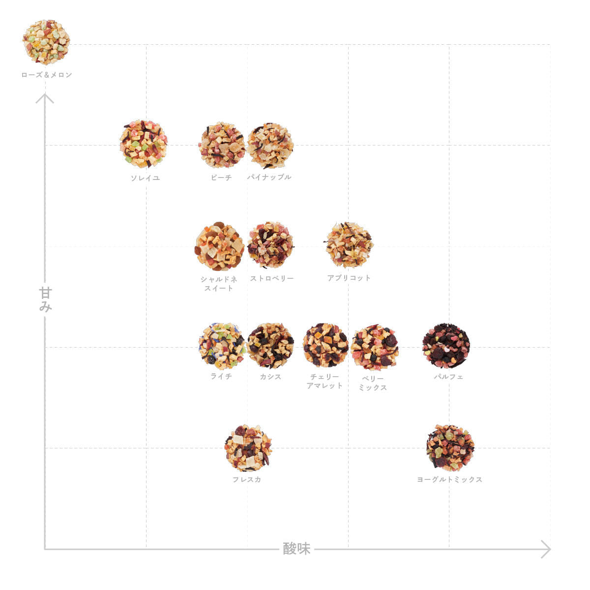有機ドライアップル(オーストリア製造)、加糖ドライマンゴー、加糖ドライパパイヤ、加糖ドライストロベリー、加糖ドライキウイフルーツ、加糖ドライバナナ、有機ハイビスカス/香料、クエン酸、保存料(亜硫酸塩)、着色料(赤40、黄4、青1)